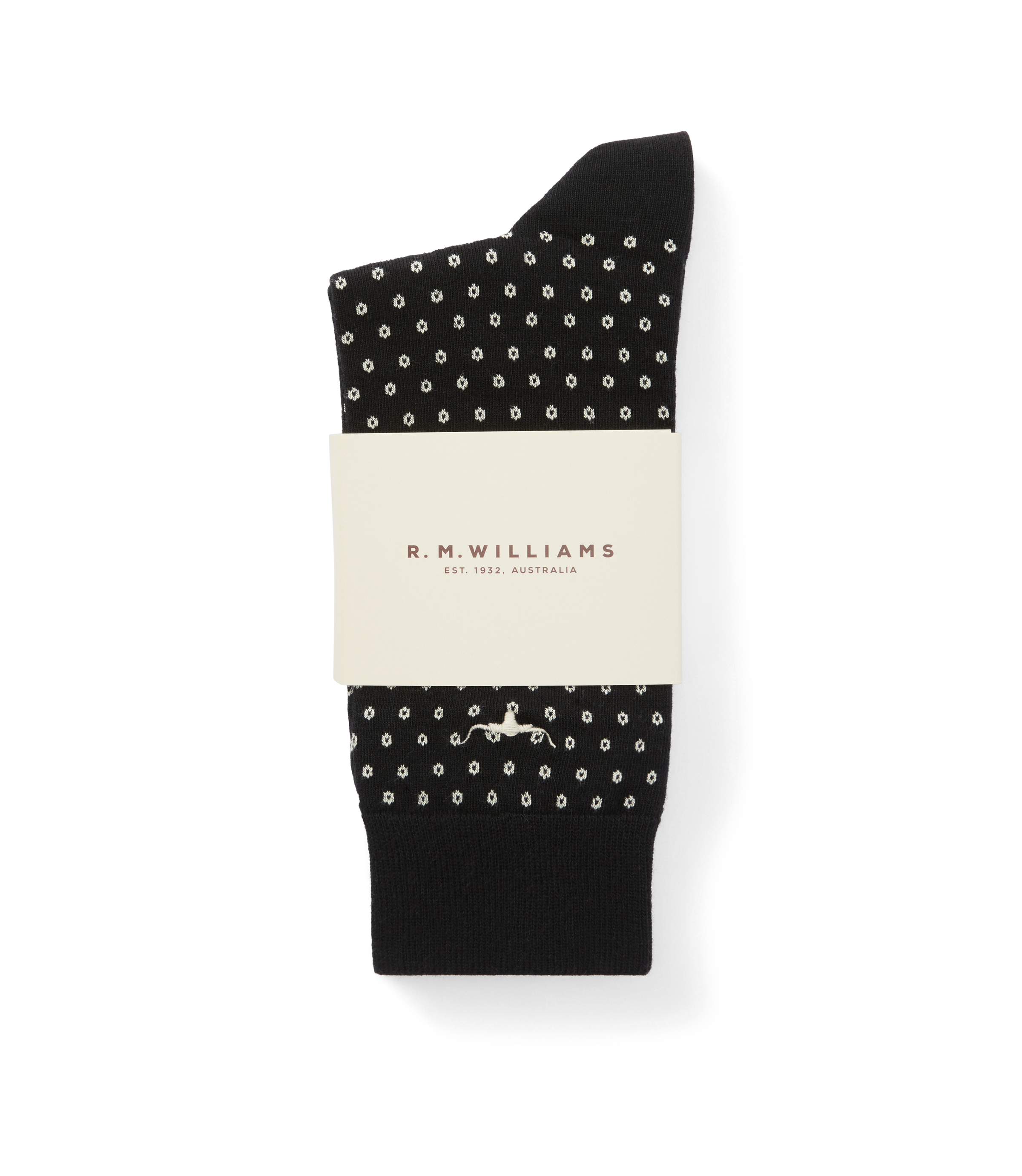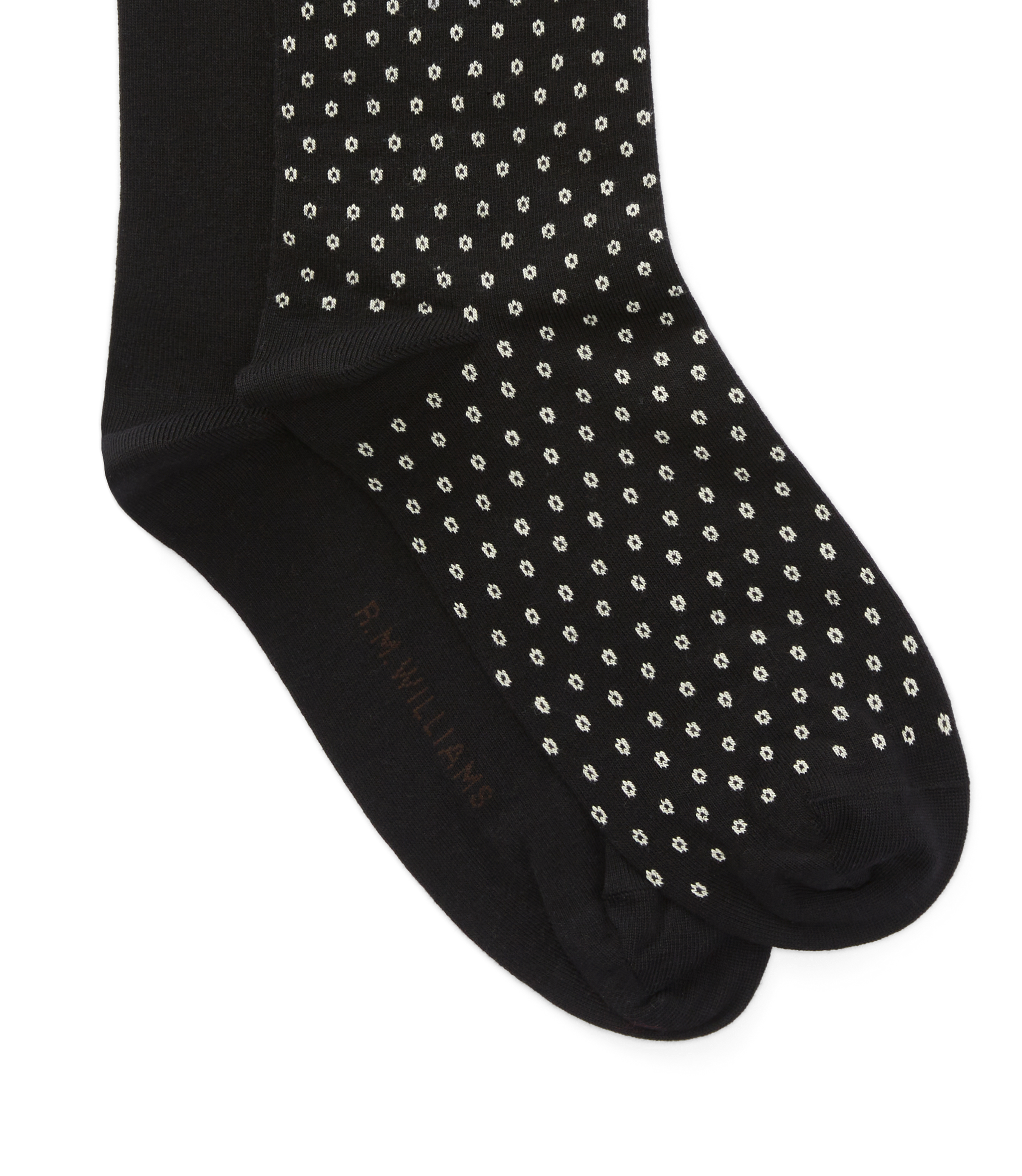 Add subtle flair to your everyday essentials with the Nelson Sock 2 Pack, featuring one solid pair and one playful polka dot pair. Crafted from a breathable organic cotton blend, these calf-length socks offer softness, durability, and all-day comfort. Finished with an embroidered Longhorn detail for a signature R.M.Williams touch.