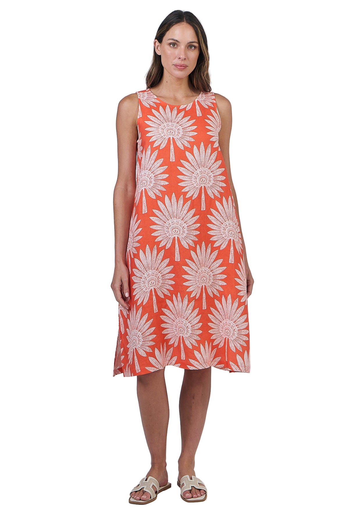 Effortlessly elegant and perfect for warm-weather days, the Linen Dress in Sunset Palm brings a touch of nature to your wardrobe. Crafted from lightweight, breathable linen, this sleeveless A-line dress features a soft round neckline and a flowing silhouette that falls gracefully to the knee. The standout detail is a beautiful natural-hued palm design set against a vibrant coral background, evoking tropical ease and timeless summer charm.